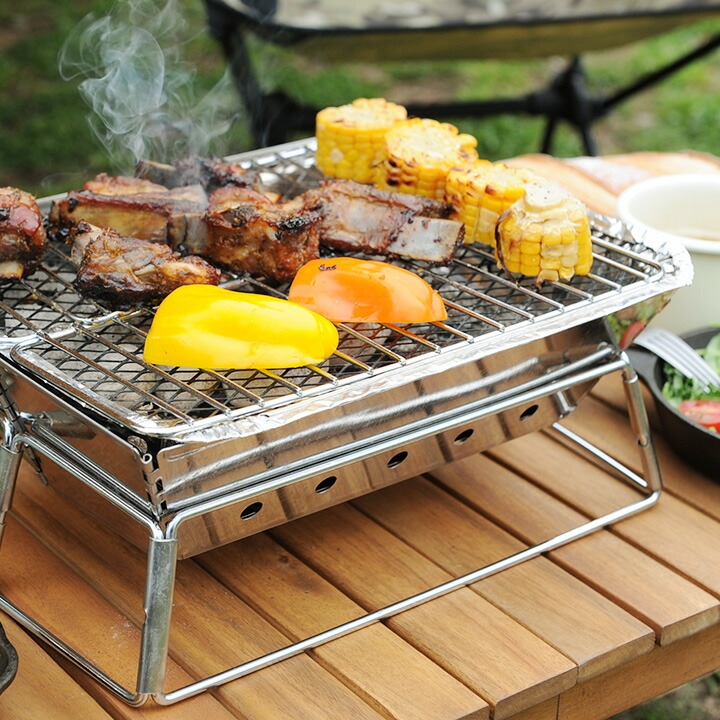 - 開けてすぐに着火できる、便利な使い捨てインスタントグリルが卓上で使えるようになる、専用コンロです。市販の炭を利用して、小型コンロとしても使用できます。全てのパーツが折りたためるのでかさばらず、付属の収納袋でコンパクトに持ち運びが可能。キャンプや登山、フェスや海水浴、ピクニックなど、お手軽に色んなシーンで本格バーベキューをお楽しみください。