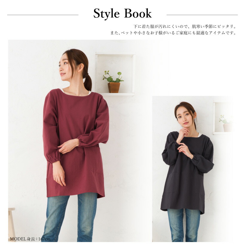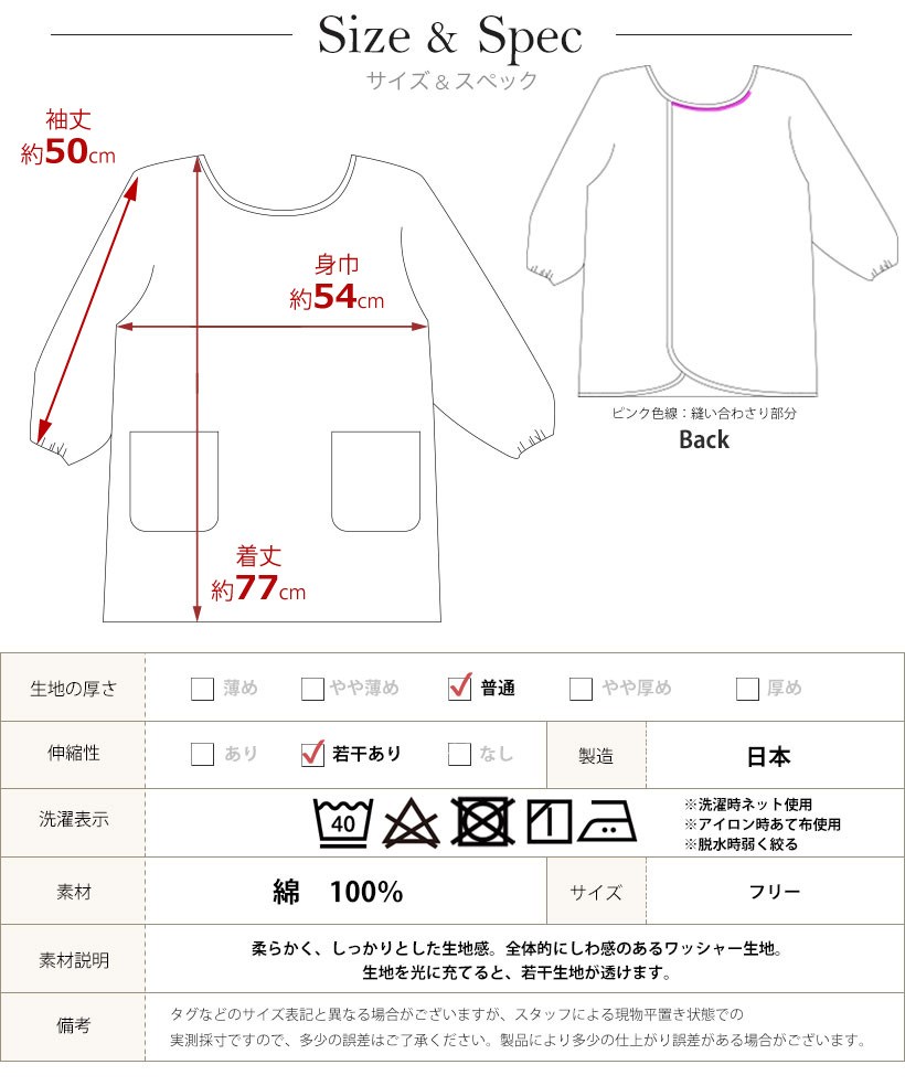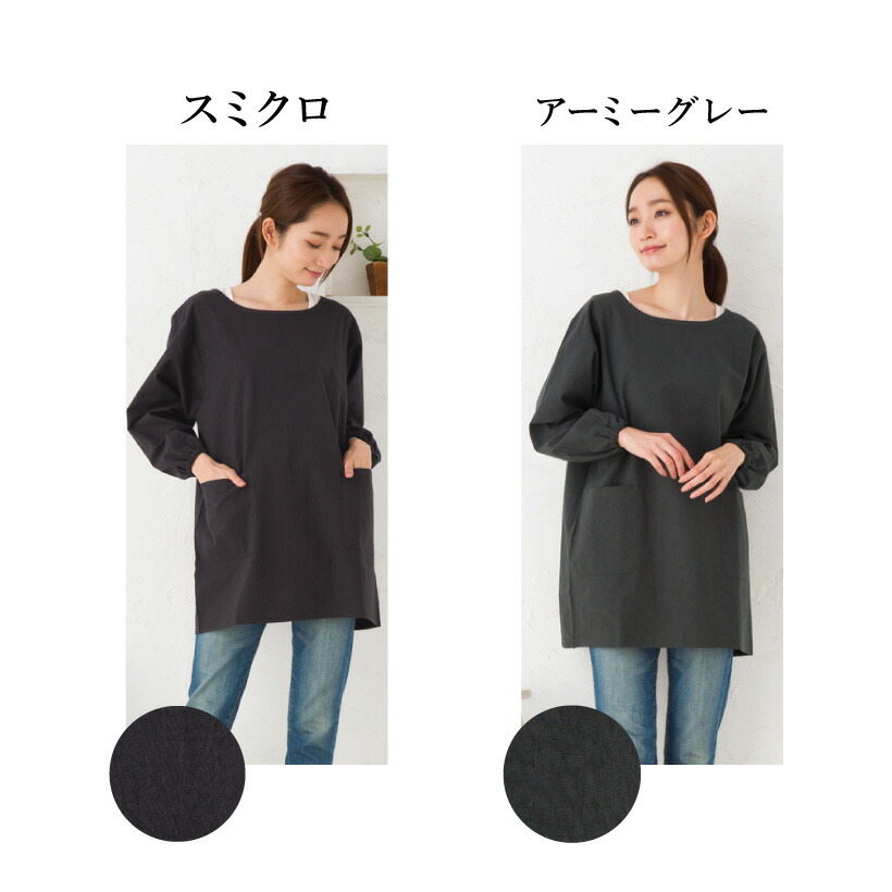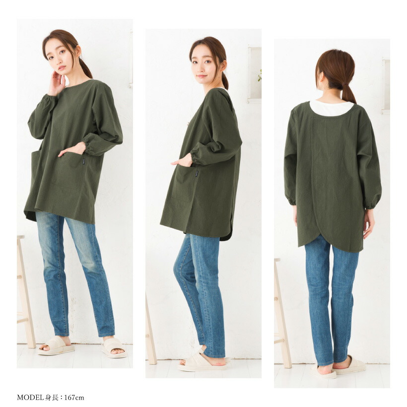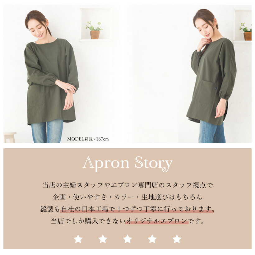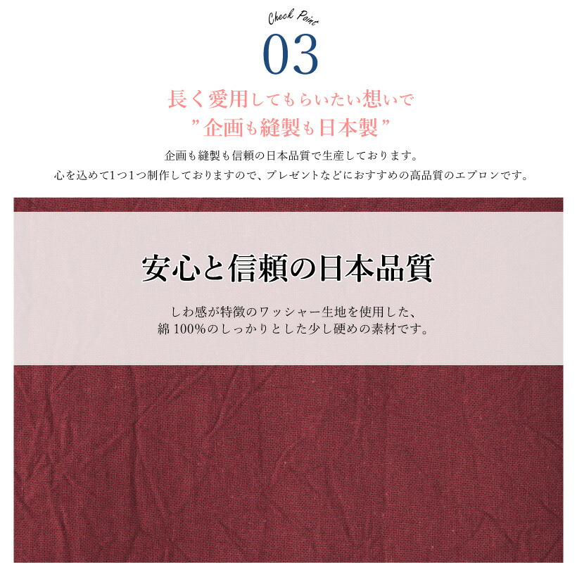 バックデザインがおしゃれな、しわ感が特徴のワッシャー生地のかっぽう着。スモックタイプのエプロンは、中に着用した服が汚れないので、小さなお子様や、ペットのいる家庭にもオススメです。デザインや生地にこだわった、丁寧な作りの日本製エプロン。工場直営のエプロン専門店ならではの高品質エプロンは、ギフトやプレゼントにも人気です。
