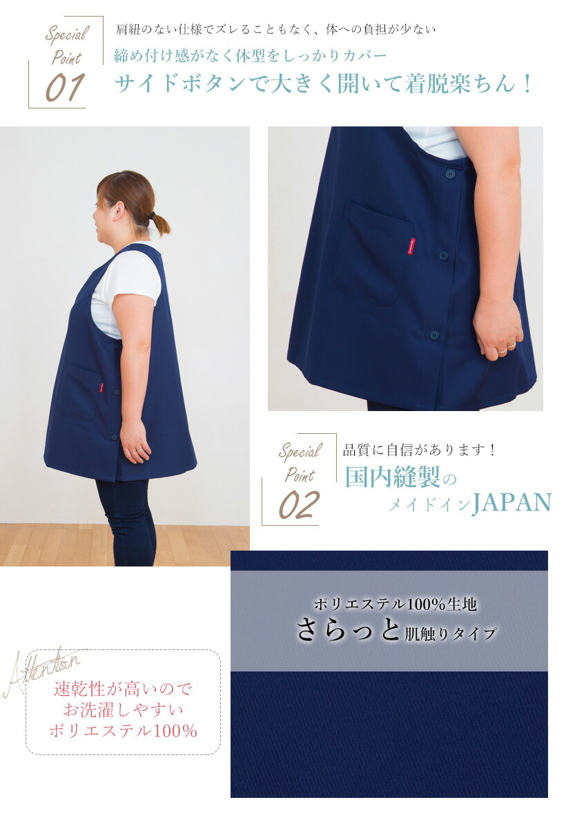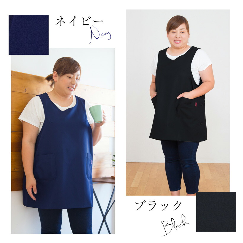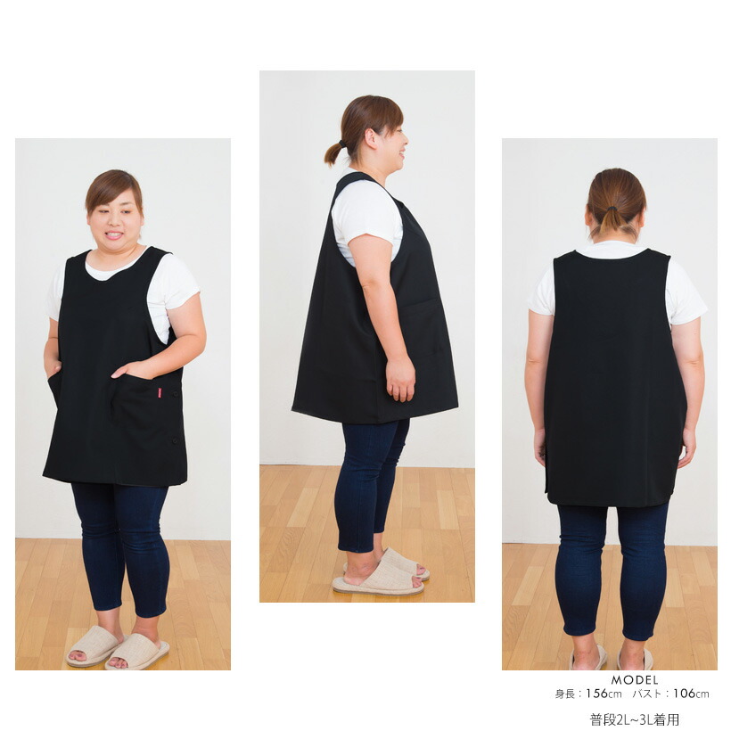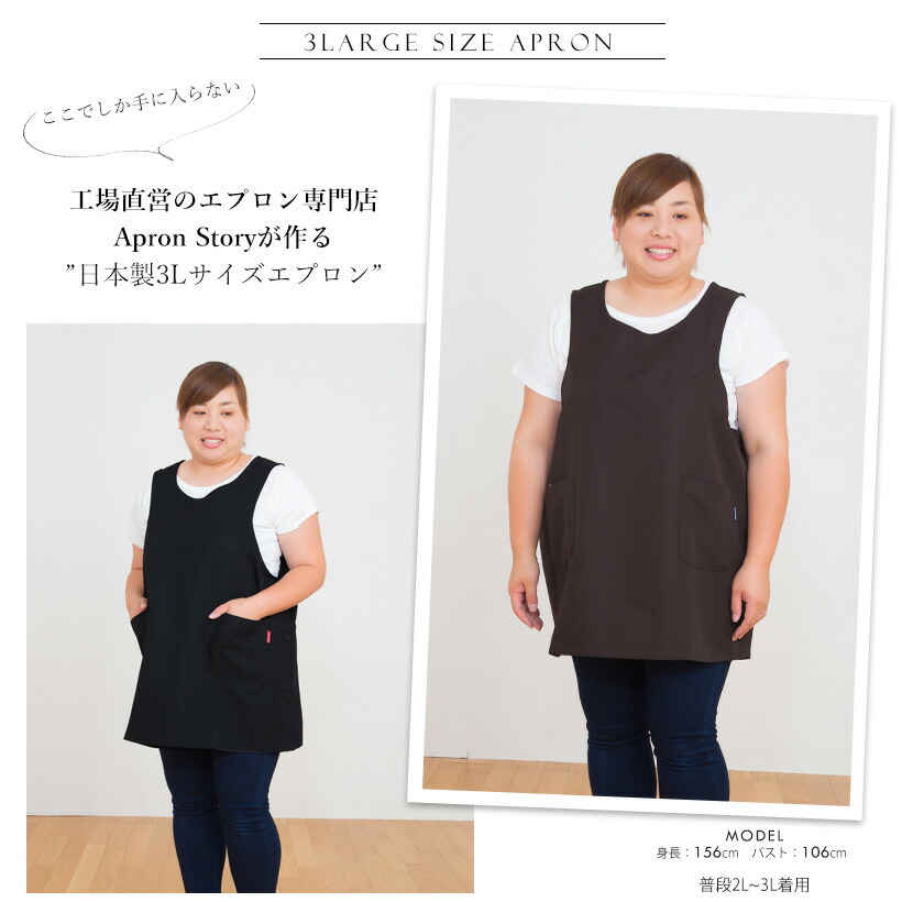 無地のシンプルな3Lサイズの ゆったり大きめ タブリエ エプロン。サイドボタンで大きく開いて着脱楽ちん♪ 便利な大きめの2つのポケット付きで使いやすい! 丁寧な作りの日本製エプロン。工場直営のエプロン専門店ならではの高品質エプロンは、ギフトやプレゼントにも人気です。