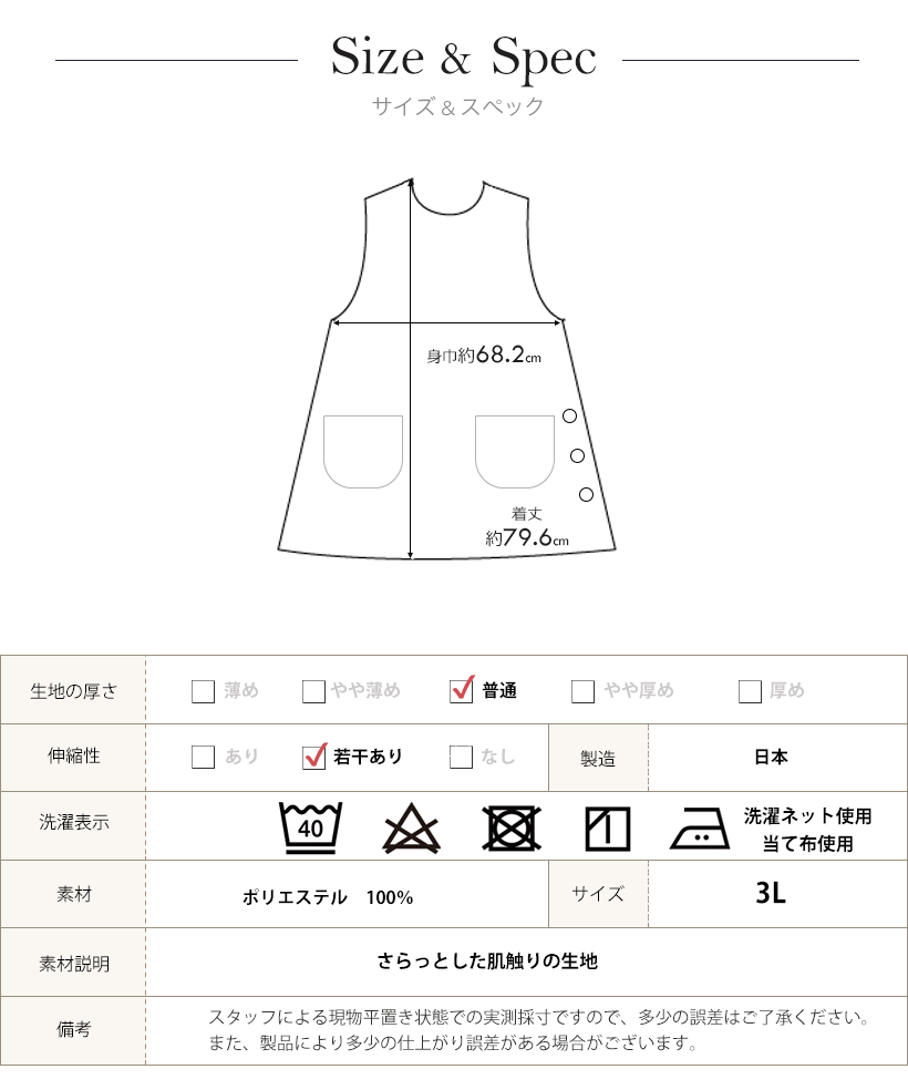 その他 ・写真の関係で実際の商品と色合いが異なることがございます。※火気に近づけますと、繊維が溶けたり、燃えたりする恐れあります。やけどの心配がありますので十分にご注意ください。※洗濯の際は漂白剤を使用しないで下さい。※生成りやパステルカラー等の淡色製品には、蛍光増白剤が入っていない洗剤を使用してください。色が変わる恐れがあります。※濃色製品は色落ちする恐れがありますので、単品で洗って下さい。※長時間濡れたままにしておきますと、移色する恐れがあります。※洗濯後は緩く絞り、すぐに形を整え日陰に干してください。※タンブル乾燥はしないで下さい。