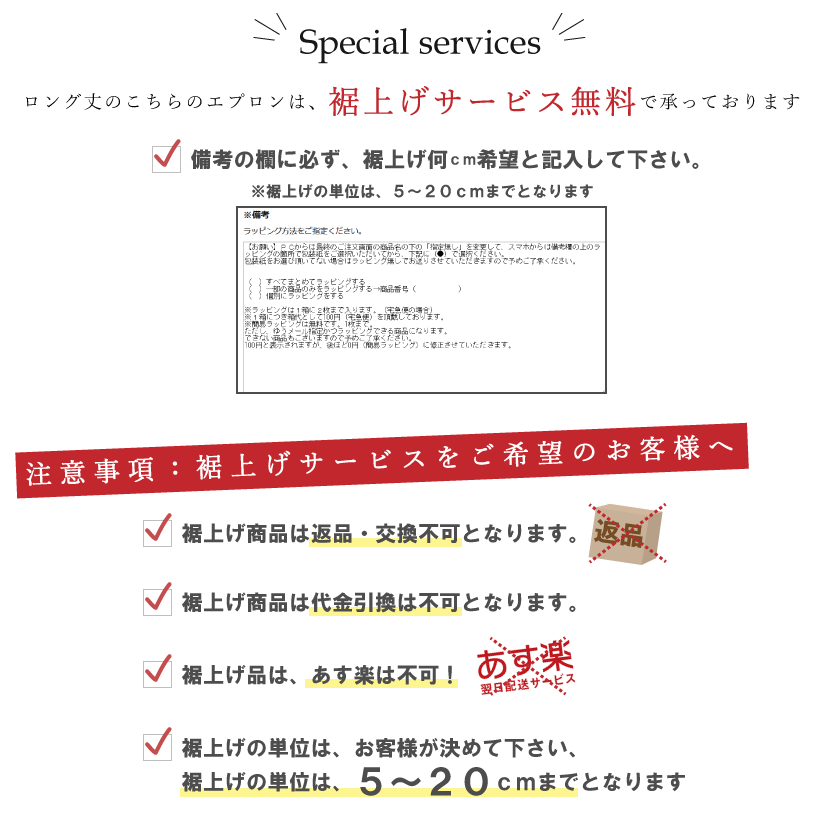 なお、すでにご使用された商品、裾上げ等の加工を施した商品につきましては返品・交換はできませんのでご了承ください。