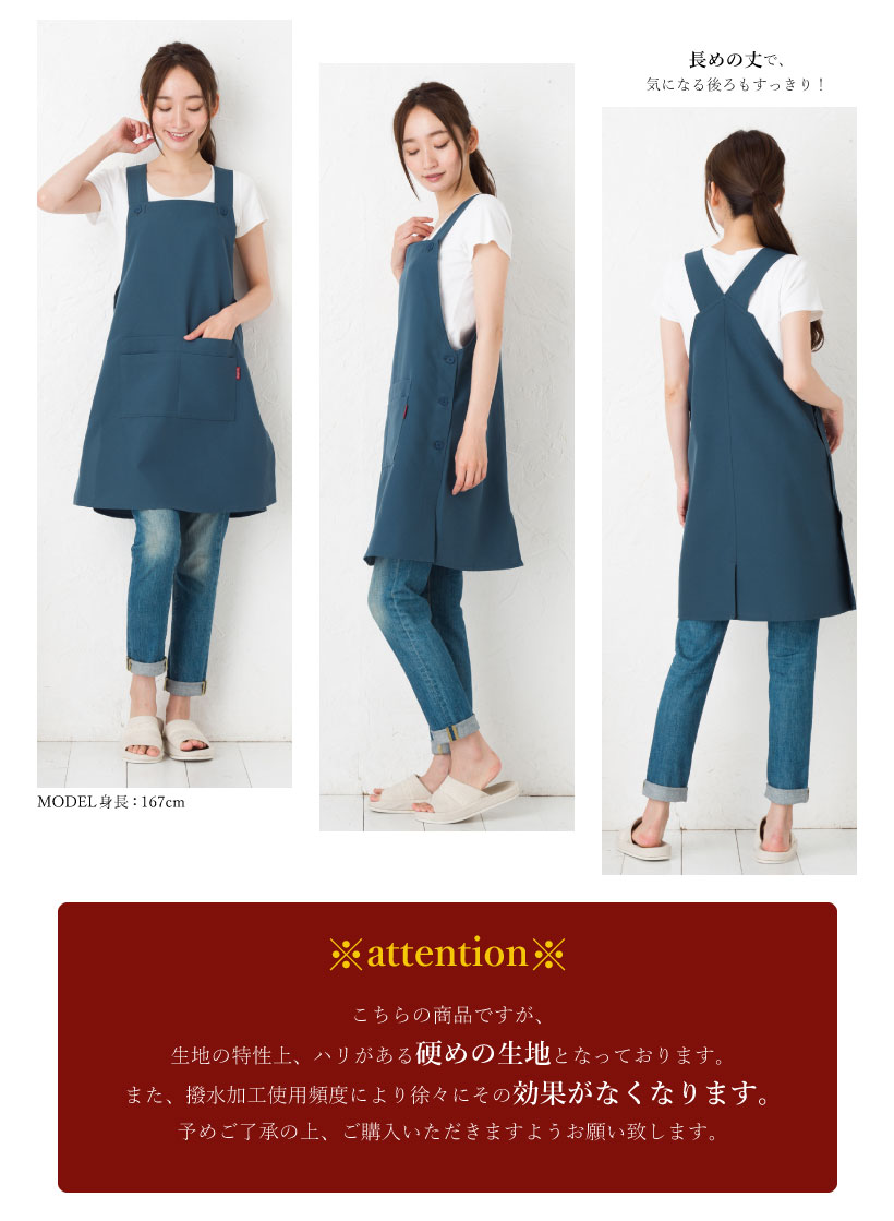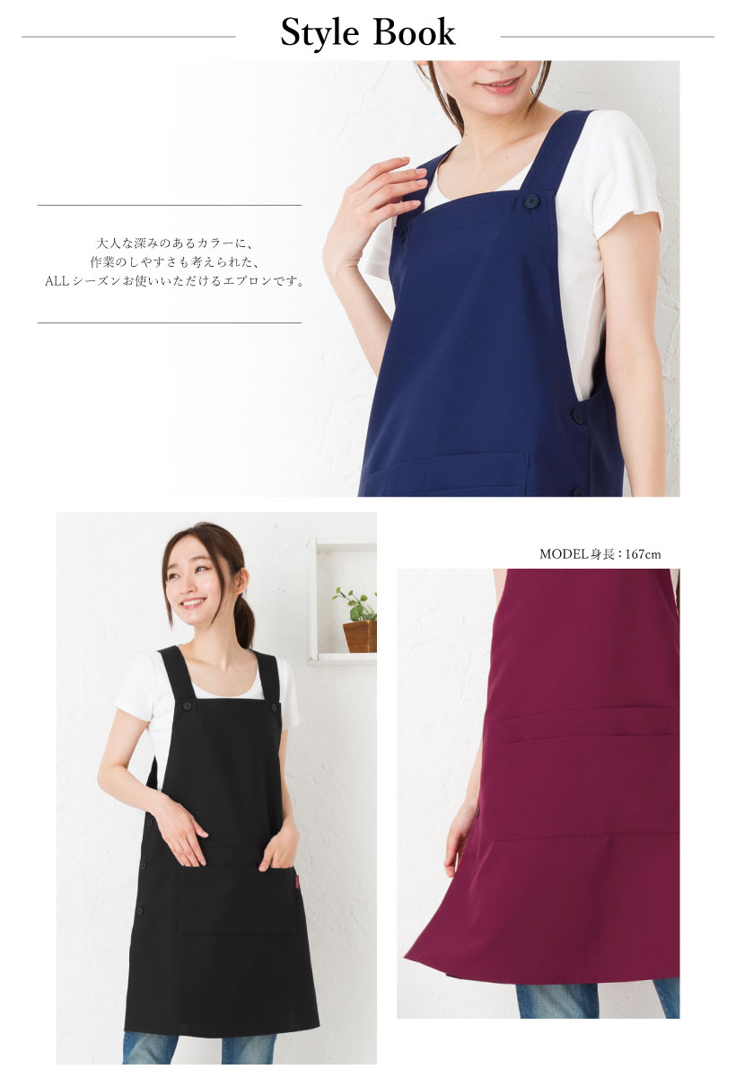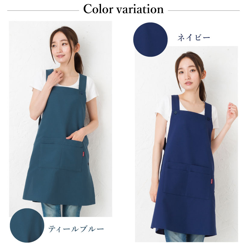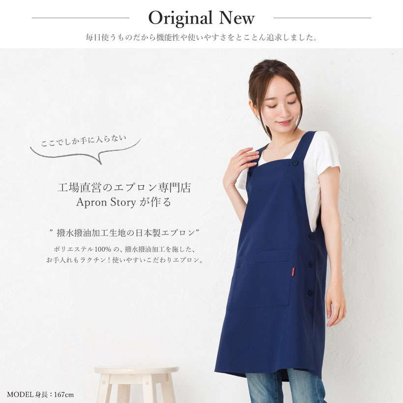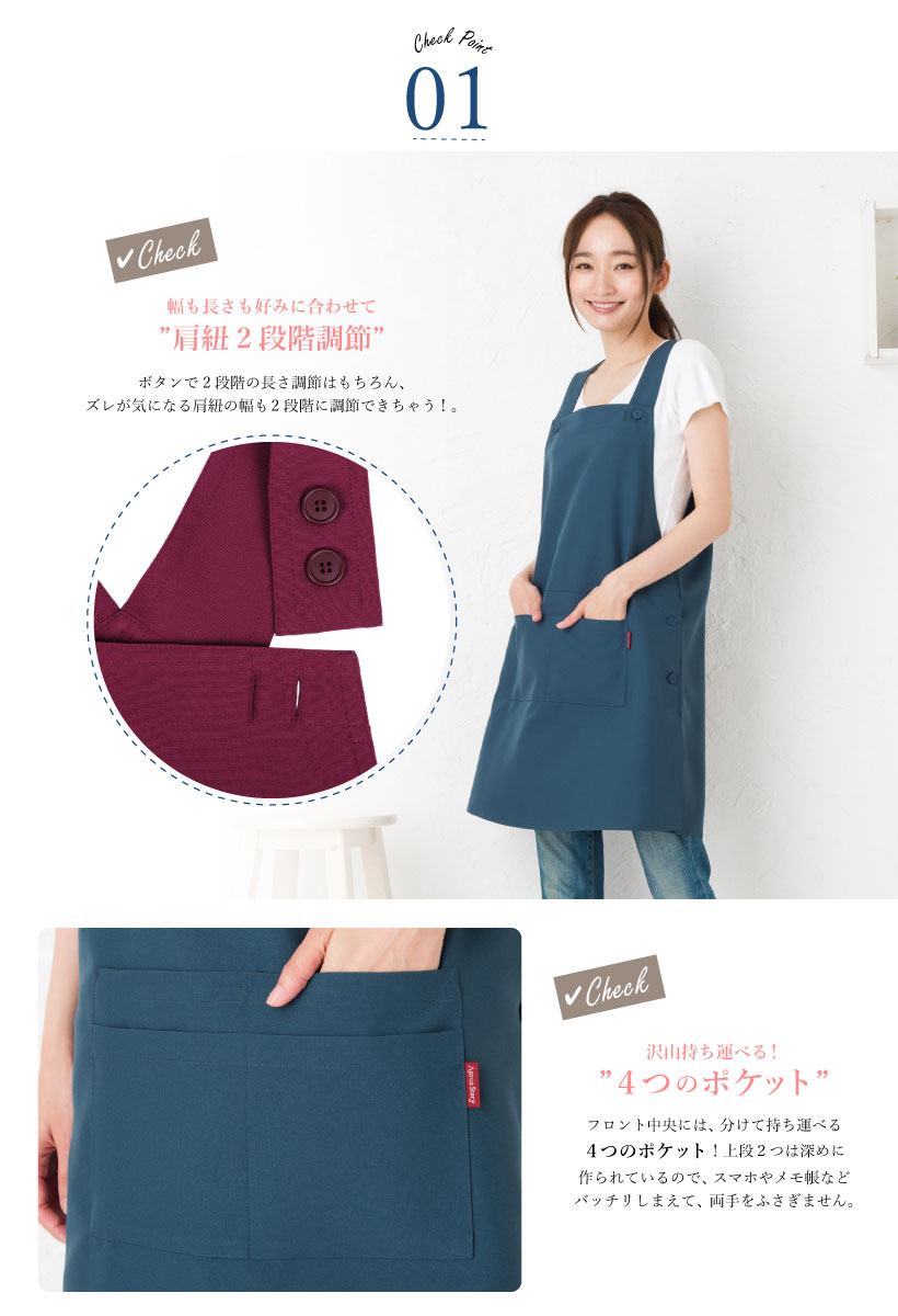 日本製のこだわりエプロン。肩紐の幅も長さもボタンで2段階調節できる、おしゃれなサロペットエプロン