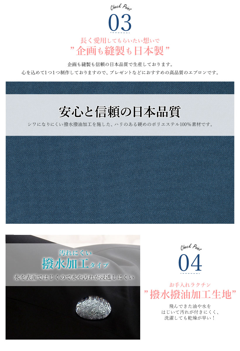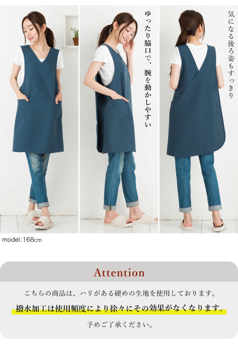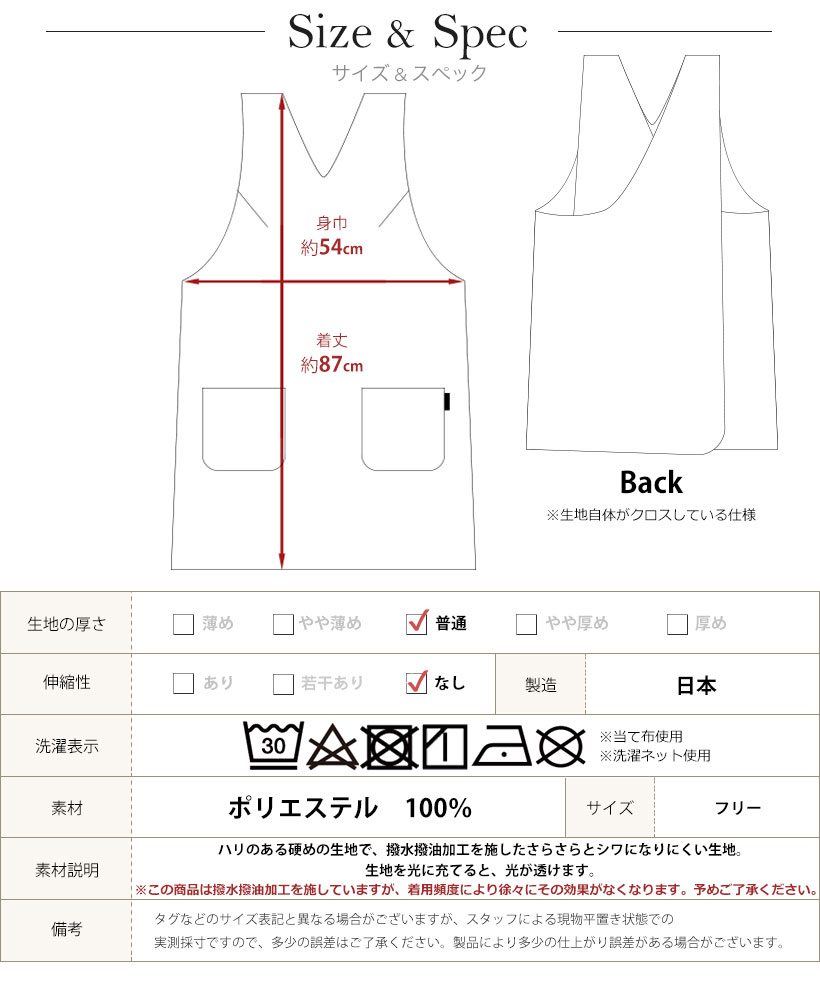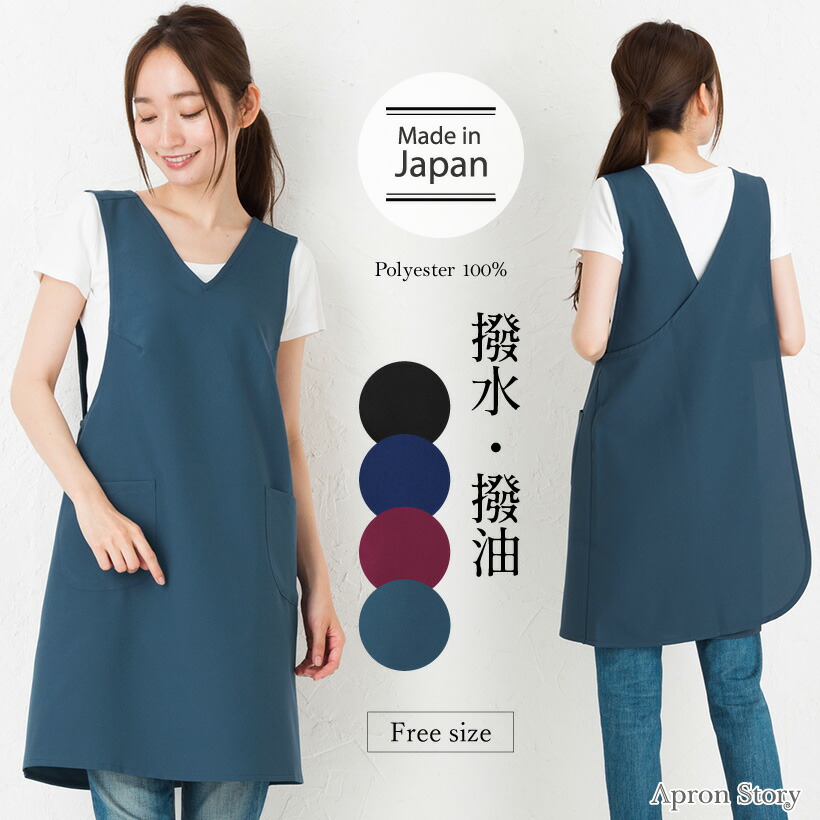 日本製のこだわりエプロン。ボタンや腰紐などのない、上からかぶるだけの着やすいエプロン