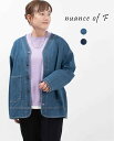 秋や春季節の変わり目に着たいデニムのジャケット風カーディガンです。nuance of ニュアンスオブエフ デニムカーデ 1ST-003 レディース ジャケット カーディガン 春 秋 ナチュラル ファッション 30代 40代 50代ファッション 大人 おしゃれ カジュアル シンプル