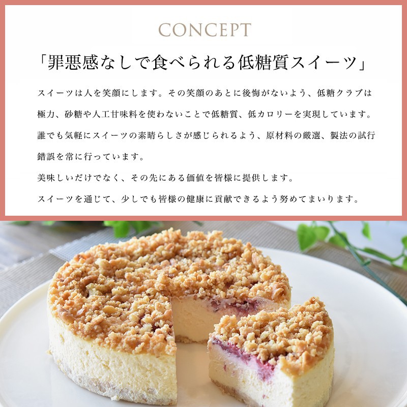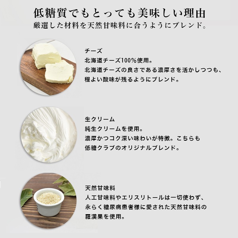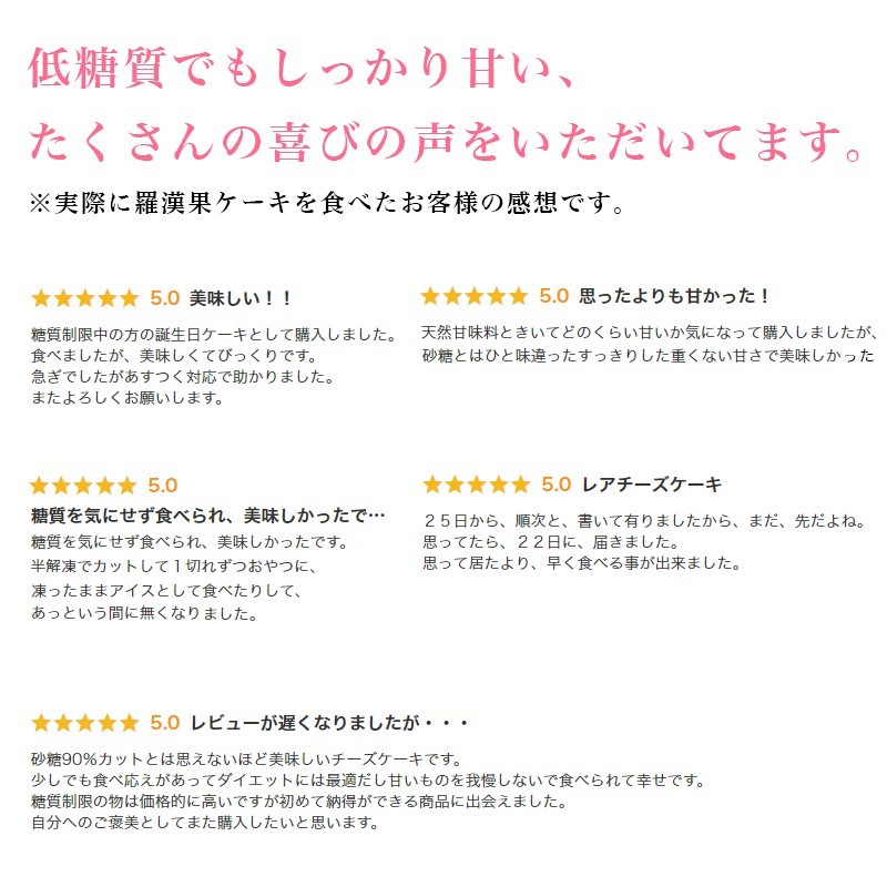砂糖の代わりに天然甘味料の羅漢果のみを使用し、人工甘味料やエリスリトールは一切使用しておりません。 糖質は6/1カットで約9g前後。 パティシエの手作りで丁寧に焼き上げました、