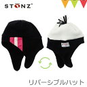 顔だけ出してとてもかわいい!耳まですっぽり覆ってあたたかい。あごの下で留められるリバーシブルなベビー帽子。STONZ(ストーンズ)リバーシブルハット ストライプブラック×クリーム/ブラック |防寒 ベビー帽子 フリース 脱げない あごの下で留める 冬用 耳あて