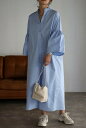 軽やかにすっきりとスタイリングが決まる大人シャツワンピースキーネックストライプシャツワンピース 77-003258