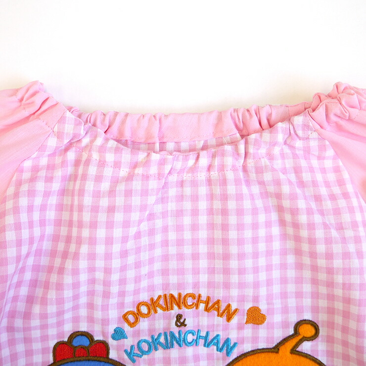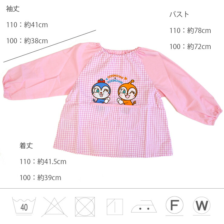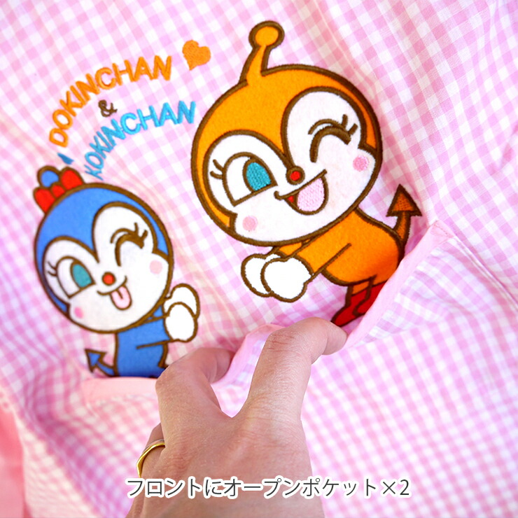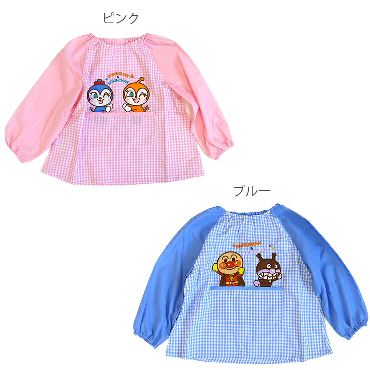 みんな大好きアンパンマンの子ども用長袖スモックが登場!ピンクにはドキンちゃんとコキンちゃんが、ブルーにはアンパンマンとばいきんまんの刺繍ワッペンが施されています☆