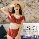ビキニ 水着 レディース レースアップ 大きなフリルが二の腕カバー ハイウエストボトムでスタイルアップ【 SALE! 最終在庫処分 】ビキニ 水着 レディース モテカワ水着 リボン レースアップ 編み上げ セパレート ボタニカル リーフ 体型カバー ハイウエスト 大きいサイズ 2点セット 大人 韓国 韓国ファッション ママ水着 パッド付き プール 夏 海 ビーチ セクシー
