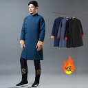 裏地起毛のあったか中国風ガウン(チャンパオ)。右肩の金糸を使った刺繍が豪華な印象を与えます。チャイナ服 メンズ パオ チャンパオ 長袍 男性用 丈長 ロング 裏地起毛 ガウン ウール 民族衣装 コスプレ衣装 中国服 漢服 【送料無料】
