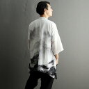 シフォン素材を使ったハーフ丈の漢服ガウン。夏場の羽織として最適なアイテムです。チャイナ服 羽織 ガウン ハーフ丈 ジャケット シフォン メンズ 男性用 丈長 山水柄 中国服 チャイナボタン 漢服 中華風 送料無料