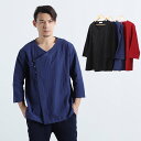 漢服のような斜め開き襟の七分袖Tシャツ。折り返し袖口をロールアップで留めるお洒落なデザインです。チャイナ服 Tシャツ チャイナTシャツ カンフー メンズ 男性用 中華風 チャイナボタン 七分袖 ロールアップ 斜め襟 【送料無料】