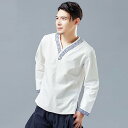 薄手綿麻の斜め襟チャイナTシャツ。伝統的漢服スタイルですがカジュアルに着こなせます。チャイナ服 チャイナTシャツ 漢服 カンフー メンズ 男性用 白袖 カフス袖 斜め襟 斜め開き 中華風 送料無料 民族衣装 綿麻