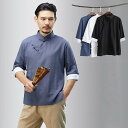ウォッシュ加工された綿麻を使ったチャイナTシャツ。柔らかで薄い素材なので暑い夏に最適のアイテムです。チャイナ服 チャイナTシャツ 漢服 カンフー服 メンズ 男性用 立ち襟 3つボタン ウォッシュ加工 チャイナボタン 中華風 綿麻 【送料無料】