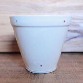 乳白色の釉に、アクセントとなる赤色と水色の点(ドット)でシンプルに表現。