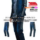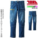 伸縮率約70%、回復率約90%、10ozデニムカーゴパンツ。RUBBER FLEX強いストレッチ性。後のポケットは大容量のスラッシュポケット。【10%OFFクーポン★6h限定1/25】寅壱 トライチ デニムカーゴパンツ 8840-219 高強度 ストレッチ 再帰性反射 ズボン オールシーズン 作業服 作業着 トライチ