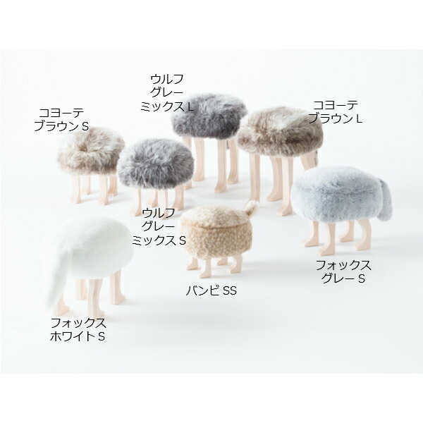ふさふさの座面にひとつひとつ丁寧に仕上げられた動物の脚。お部屋のアクセントにピッタリなかわいいしっぽのついたユニークなアニマルスツール。玄関先での靴やブーツの着脱時や、リビングでソファー近くに置いてオットマンとして使用したり、子供用の椅子など様々な使い方ができる小ぶりで便利なスツールです。帰宅時にはかわいく出迎えてくれます。SS,S,Lの3つのサイズ展開と、さわり心地の違うファーを使用した2種類の座面、全7型のラインナップからお選びいただけます |