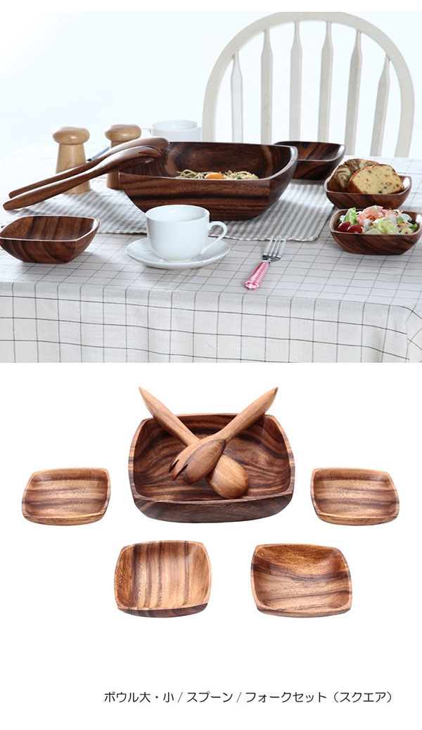 木製のサラダボウルは家庭用やプレゼントにぴったり♪ スプーンとフォークも付くし、料理を小分けできる小皿とパスタ用に使える大皿のセット!
