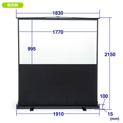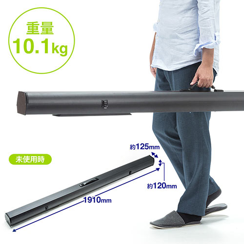 自立式・床置き式の80インチワイドサイズ(16:9)のプロジェクタースクリーンです。必要な場所に持ち込み、スタンドを開いて引き上げるだけであっという間に設置ができます。好きな位置で固定できるので、設置場所に応じて微調整が可能です。