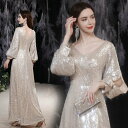 パーティー ドレス ロングドレス ワンピースウエディグドレス 二次会 花嫁 結婚式 発表会 演奏会 衣装 2L 3L 海外挙式 プラスサイズ 前撮りカラードレス 前撮りドレス 袖あり ロング【着後レビュー特典】キラキラ輝くゴールドが美しい すっきりシルエット 深Vネック スレンダーラインドレス スパンコール パフ袖 パフスリーブ 長袖 お色直し ワンピース ウェディング ドレス 披露宴 衣装 発表会【cd-0335】