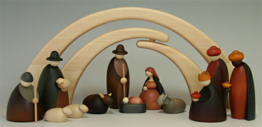 このクリッペはマリア・ヨゼフ・幼子イエス・羊飼い2人・三人の博士・牛・ロバ・羊2頭の12点に厩をあらわすアーチがついたセットです。