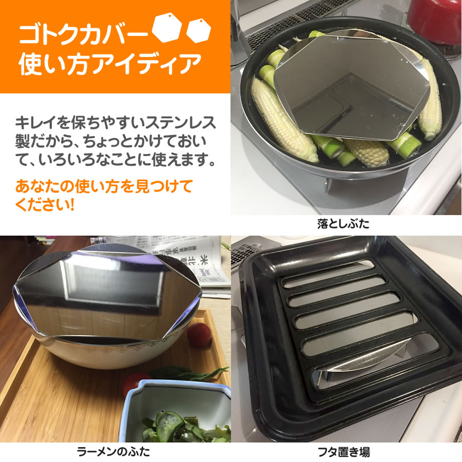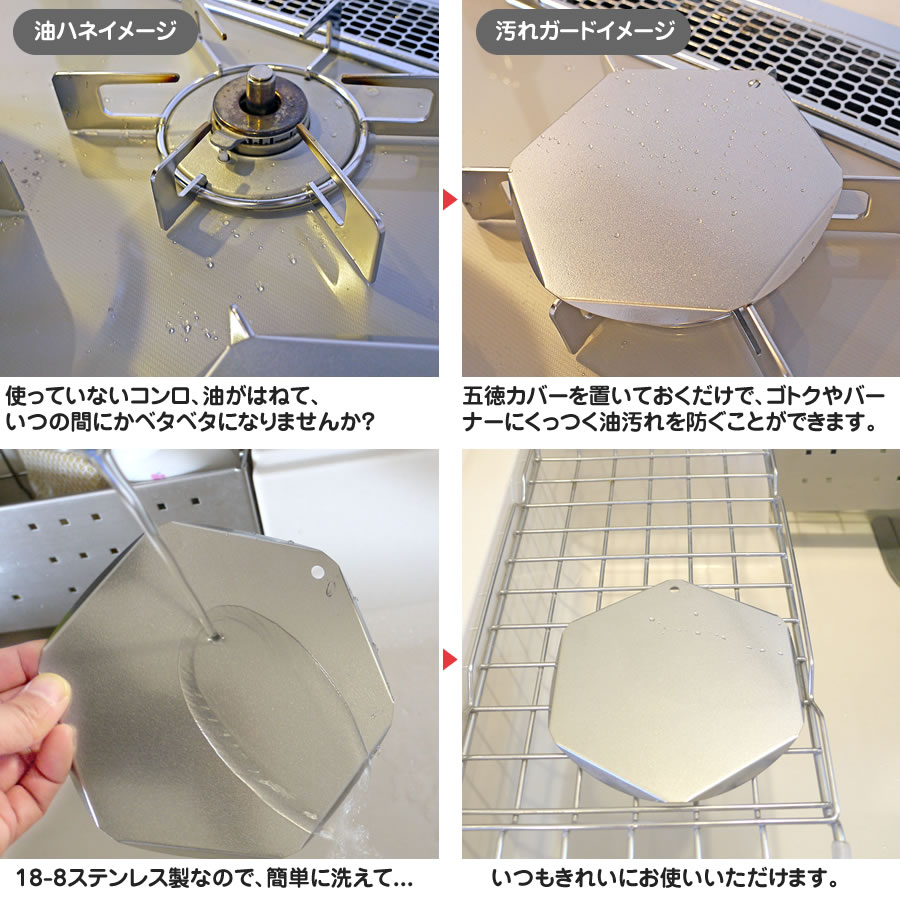 ほとんどの6本爪ゴトクに対応する、ゴトクカバーをかぶせておけば、 調理中のお鍋やフライパンから飛び散った汚れを受け止めてくれます。 清潔を保ちやすいステンレス製だから、汚れたらサッと洗えます。