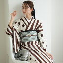 着物 単品 ポリエステル着物 袷着物 レディース着物 袷着物 単品 utatane フリーサイズ(適応身長154-165cm) 着物 日本製 ストライプ レディース 茶 女性 半身 大粒ドットとモダン縞々 ミルク×チョコ ちりめん バイカラー アシンメトリー