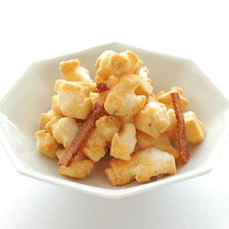 餅米(国産)、植物油脂、食用米油、たこ、食塩、たこ風味調味パウダー(貝エキスパウダー、砂糖、えび調味パウダー、ブドウ糖、粉末醤油、調味パウダー)、たら、鮭、清酒、みりん、粉末水飴、パン粉、香辛料、調味料(アミノ酸等)、香料、二酸化ケイ素、焼成Ca、ソルビトール、リン酸塩(Na)、くん液、V.C、パプリカ色素、カラメル色素(原材料の一部に小麦、えび、大豆、ゼラチンを含む) |