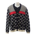 GGジャガードが魅せる、上質なボーダーカーディガン。カジュアルにもエレガントにも映える、洗練された大人のための一枚。グッチ GUCCI ボーダー GGジャガード 523048_X9107 カーディガン コットン ネイビー 紺 メンズ カジュアル【中古】【Aランク】