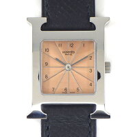 エルメス HERMES 腕時計 Hウォッチ HH1.210 スクエア コーラル ピンク ギョーシェ文字盤 SS ブラック ヴォー・エプソン レザーベルト クオーツアナログ 【箱・保付き】 【中古】