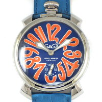 【15日限定★ポイント3倍】 ガガミラノ GaGa MILANO 腕時計 マヌアーレ 48 5010.08S スモールセコンド 裏スケ 夜光インデックス 夜光針 オレンジインデックス ブルー文字盤 SS ブルー レザーベルト 手巻き 【中古】