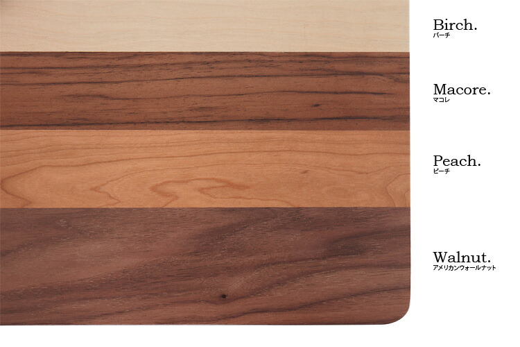 天板には4種類(アメリカンウォールナット・バーチ・ピーチ・マコレ)の天然木の突板を使っています。着色せずにクリア塗装を施すことで、暖かみのある、モダンな雰囲気に仕上げています。