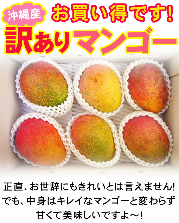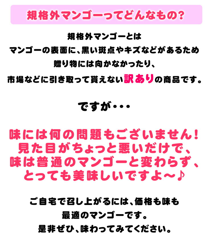 しつこいようですが、訳ありマンゴは、 ●見た目が良くありません。(表皮がきれいな紅色でなかったり、多少キズや黒い斑点があったりします。) ●大きさが不揃いです。しかし、中身は美味しいマンゴです! 自分用に最適ですよ〜♪