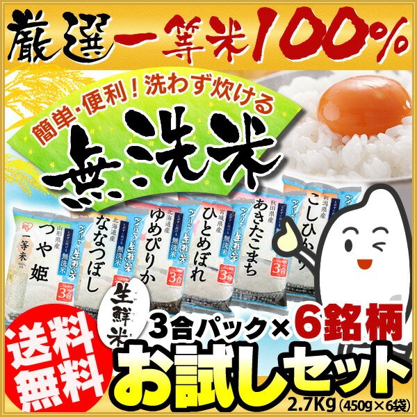 当店イチオシのパックご飯はこちら! 無洗米 お試しセット 3合パック×6銘柄(2.7kg) 《ゆめぴりか つや姫 こしひかり あきたこまち ひとめぼれ ななつぼし》 送料無料 生鮮米 がずに炊ける 栄養成分たっぷり 節水 旨味成分 アキタコマチ コシヒカリ