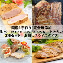 完全無添加 国産鶏スモークチキン 生ベーコン ロースハム そのままお酒のおつまみにサンドイッチにおすすめです!セット小分け BBQ 生ベーコン 筋トレ ケトジェニック 糖質制限 歳暮【お年賀】 冬ギフト 盛り合わせ 送料無料!完全無添加ベーコ ギン&ハム スライス3種セット!【完全無添加手作り★生ベーコンスライス120g前後★スモークチキン150g前後★ロースハム110g前後】国産豚 国産鶏 保存料・着色料・砂糖不使用 贈答 お歳暮 お中元