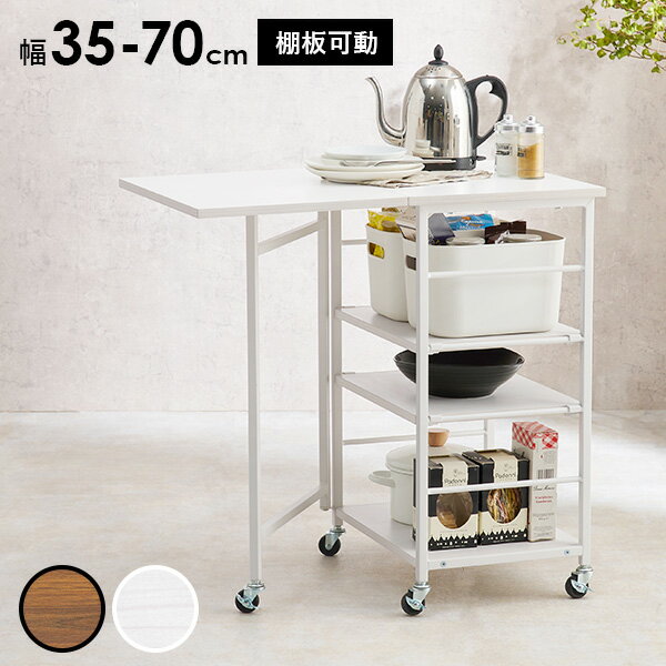 天板がバタフライ式の折りたたみワゴン。作業台として使える広がる天板が便利!コンパクトで使いやすい省スペースなマルチワゴンはキッチン、ランドリー、サイドテーブルなど使い方色々バタフライ天板 キッチンワゴン キャスター付き 高さ85cm 幅35-70cm 可動棚 (木製 マルチワゴン スリム コンパクト ハイタイプ キッチン収納 キッチン ワゴン ラック 隙間収納 天然木 ランドリーラック リビング おしゃれ シンプル 作業台 折りたたみワゴン)