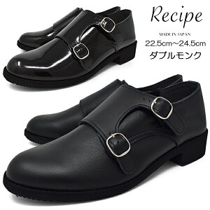ダブルモンクシューズ レディース カジュアルシューズ【Recipe レシピ】ベルト ラウンドトゥ スリッポン 軽い 本革 ソフトレザー 軽量 中敷 疲れない ローヒール ブラック エナメル 靴 幅広 2E EE くつ 日本製 ブランド RP-319 ニューイヤー 新年
