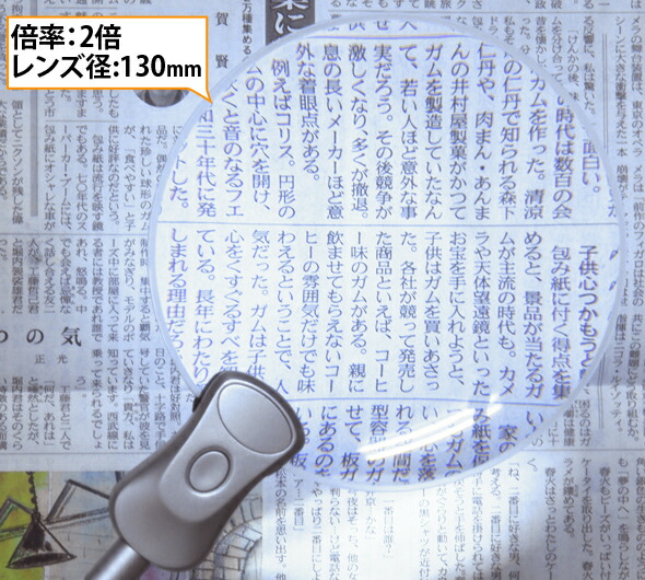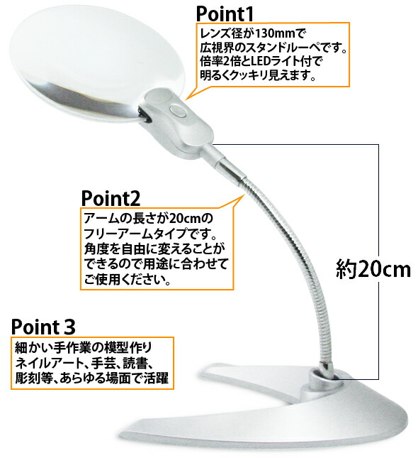 - レンズ径が130mmで広視界のスタンドルーペです。倍率2倍とLEDライト付で明るくクッキリ見えます。