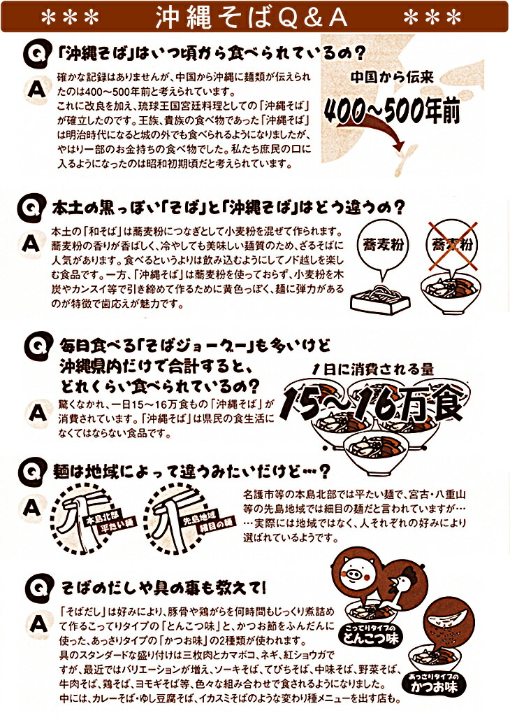 本土復帰後、「沖縄そば」という呼び名が禁止されたことがあります。 藁麦粉を使用している本土の「そば」に対して、沖縄そばは藁麦粉を一切使用していないという理由からでした。沖縄生麺共同組合は 昔から「そば」として親しまれてきた歴史ある呼称を存続させようと 運動を展開し、その結果、昭和53年10月17日に「沖縄そば」の 呼称認定を受けました。 っというわけで、毎年10月17日は「沖縄そばの日」なんです。