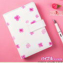 かわいいシステム手帳 バイブルサイズ6穴 女性に人気の手帳白い革にピンクの花模様のシステム手帳 おしゃれ バイブルサイズ