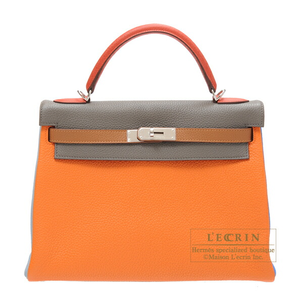 Hermes Kelly arlequin bag 32 retourne Tri-color Orange/Etain grey/Sanguine Clemence leather