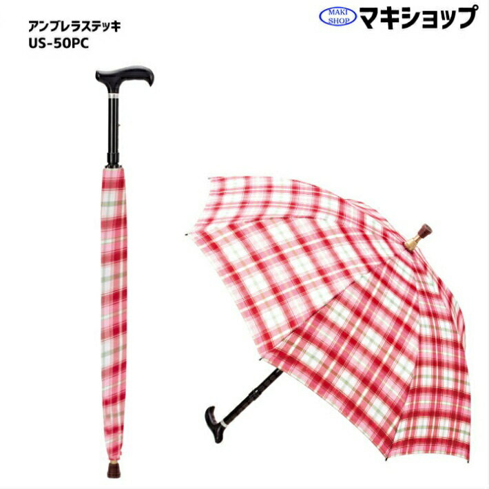 マキテック 雨天時には杖と傘を分けて使えます。P5倍 2/10 1:59まで 杖 ステッキ 傘 杖 介護用品 上品 伸縮 先ゴム アンブレラステッキ ピンクチェック US-50PC 父の日 母の日 プレゼント 孫 祖父 祖母