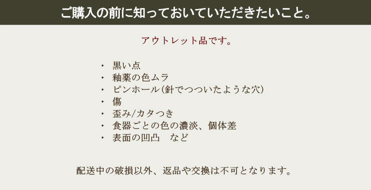 ・ 鉄粉(黒や茶の点)、ピンホール(針でつついたような穴)、釉薬のムラ・剥げ、傷、ボロ(凹凸)、歪み、カタつき等があるアウトレット品です。