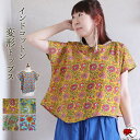 涼しげなインド綿のボタニカル柄半袖トップス。植物 花柄 アシンメトリー サラサラ 華やか 可愛い イエロー グリーン ブルー フレンチスリーブ 体型カバー マーブルマーケットインド綿 半袖 トップス エスニック インドコットン ボタニカル 総柄 変形 ゆったり ショート丈 レディース 涼しい 春 夏 ナチュラル 綿100% ファッション アジアン ボヘミアン 大人 カジュアル【メール便可 1cm】【3】