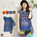 アシンメトリーな袖が個性的なアフリカン柄トップス。ボヘミアン ドルマン ラウンドネック 派手柄 オシャレ 幾何学模様 カラフル プリント 衣装 オリジナル マーブルマーケットエスニック アシンメトリースリーブ トップス コットン 綿100% レディース カンガ柄 アフリカン柄 総柄 五分袖 フレンチスリーブ ノースリーブ カジュアル 春 夏 秋 ファッション アジアン【メール便可 1.5cm】