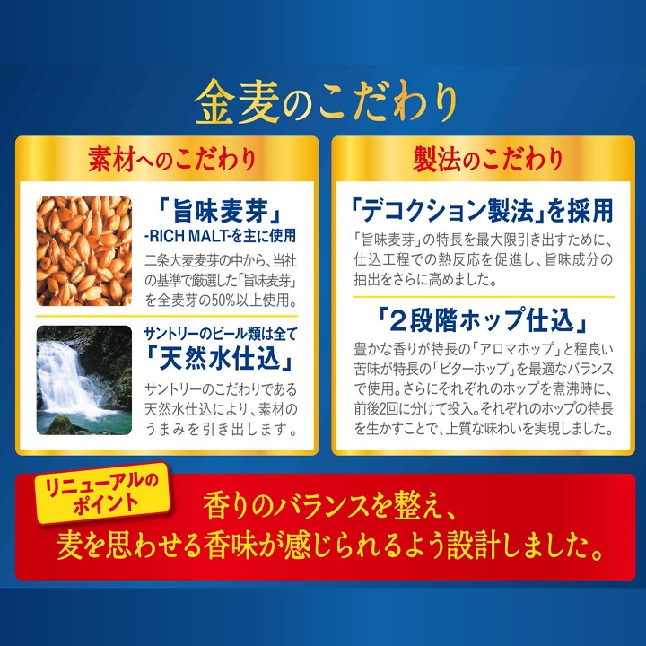 ■商品説明サントリーの新ジャンル、金麦の2ケース(48本)まとめ売りです。金麦は、「旨味麦芽」を使用し、天然水仕込みで麦のうまみを引き出したコクのある味わいです。豊かな麦の旨みと、バランスの良い後味をお楽しみ下さい。