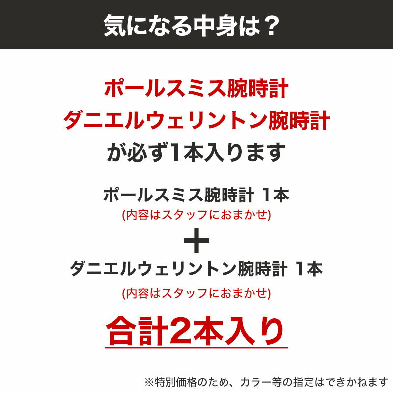 | | 【在庫なくなり次第終了】腕時計ガチャ | 定番人気ブランドポールスミスの腕時計とダニエルウェリントン腕時計が必ず1点ずつ入る、在庫限りの超お得なセット。在庫なくなり次第終了の為お急ぎ下さい。