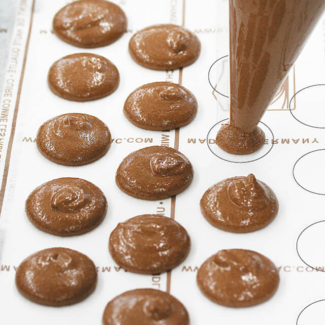 | ショコラマカロンが20個できるキットです。キットに含まれるマカロンミックス粉「ラピッドマカロン」は、簡単にメレンゲを作ることができ、マカロンの仕上がりを左右する生地の乾燥も必要ありません。また、初めての方でもチャレンジしやすいよう、絞りの大きさを均一にするガイドシート、マカロン生地用の絞り袋、アイシング用の絞り袋付き。 |