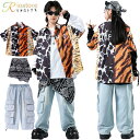 ダンスの発表会やコンテストなどのチーム衣装としておすすめ★アニマル柄 ダンス 衣装 キッズ セットアップ 半袖 シャツ ブラック デニム パンツ アニマル ダンス衣装 キッズ 派手 虎柄 牛柄 シャツ 男の子 女の子 ヒップホップ 腰巻風 KPOP 衣装 韓国 ストリート 発表会 黒 カーゴパンツ デニムパンツ