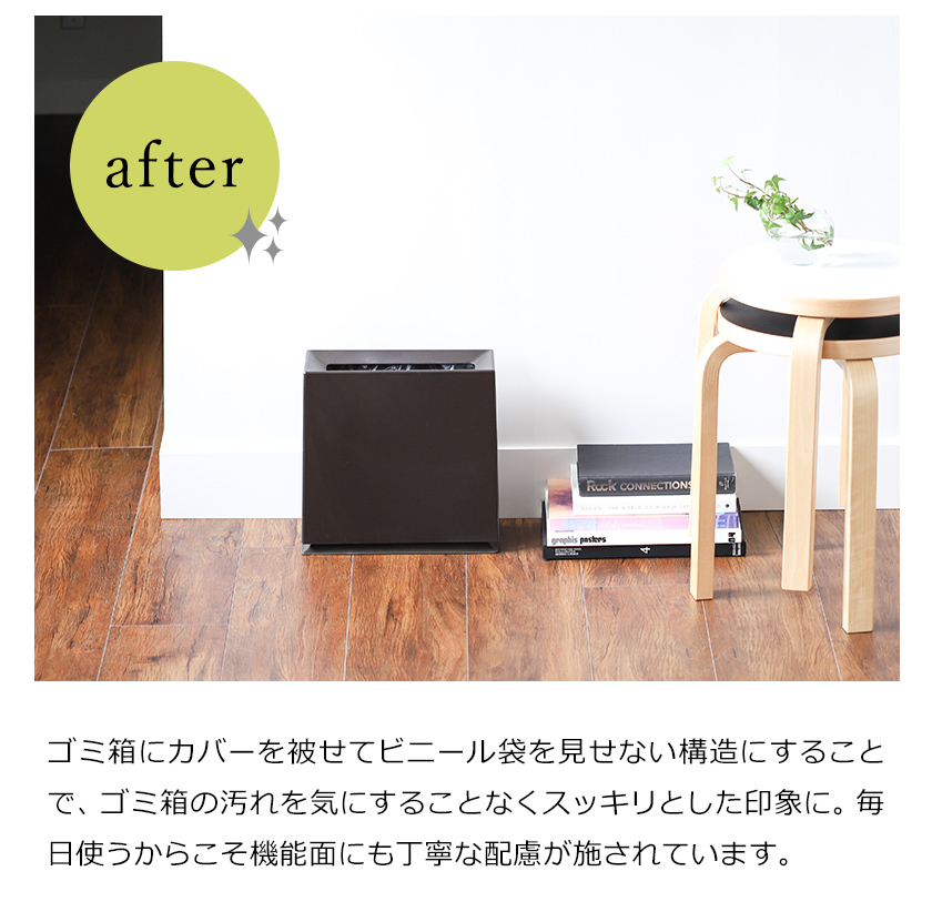ゴミ袋が外から見えず、インテリアを邪魔しません。更に、ゴミの分別ができるので、かなり気に入っています。サイズの割に金額が高く感じたので星を一つ減らしてあります。
